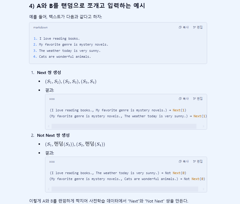 - NSP (Next Sentence Prediction) : 다음에 나올 문장을 예측하는 과정