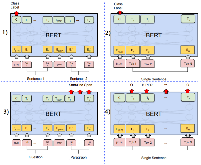 이러한 방식을 사용해서 pre-training 시킨 BERT 모델을 SQuAD Q&A와 같은 task나 NER 등 각 task에 맞게 적절히 fine-tuning 해서 예측한다면 성능이 굉장히 잘 나오고, SOTA도 달성했다고 논문에서 밝히고 있습니다.