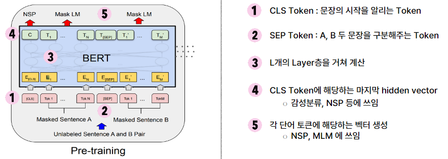 - CLS 토큰에 해당하는 마지막 hidden vector가 나와 이를 참고해서 감성분류, NSP 등에 활용