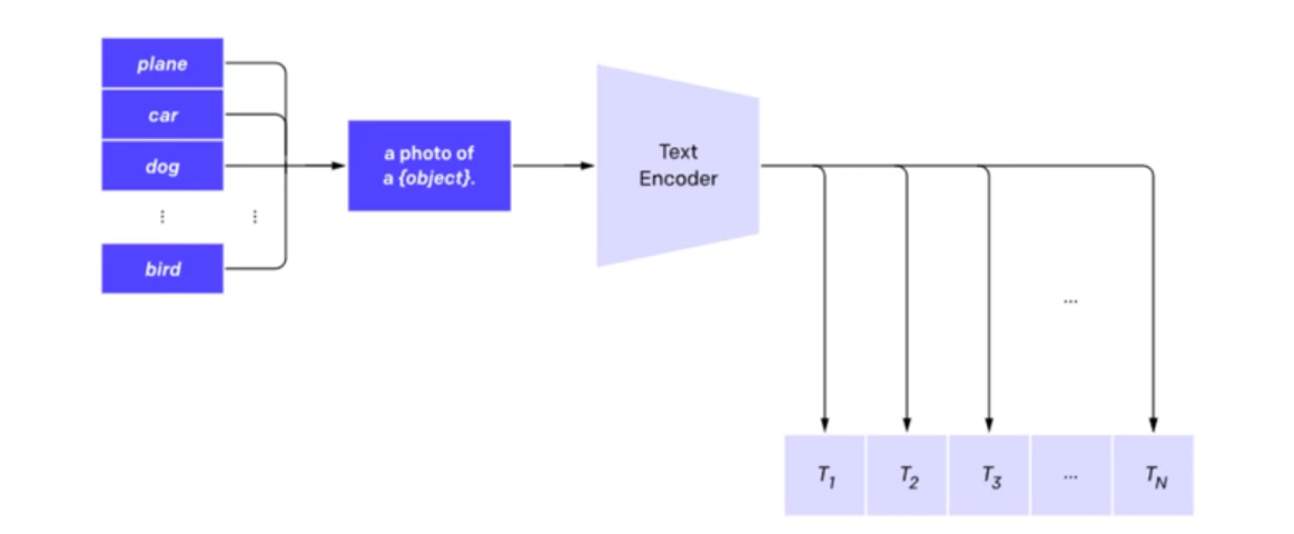 두 번째로 텍스트에 대한 데이터셋을 구성할 때 단순 단어가 아닌 'a photo of a (object)' 에 해당하는 구로 변환해서 사용했다고 합니다. 단어에서 구로 변환하여 인코더를 입력했을 때 정확도가 1.3 정도 향상되었다는 실험 결과를 내었습니다. 아마 텍스트 라벨 중에 그냥 단어보다 문장이나 구의 비율이 많아서 그렇지 않을까 생각하고 있습니다. 이후 학습된 텍스트 인코더에 통과시켜 텍스트에 대한 Embedding Vector값을 산출합니다.