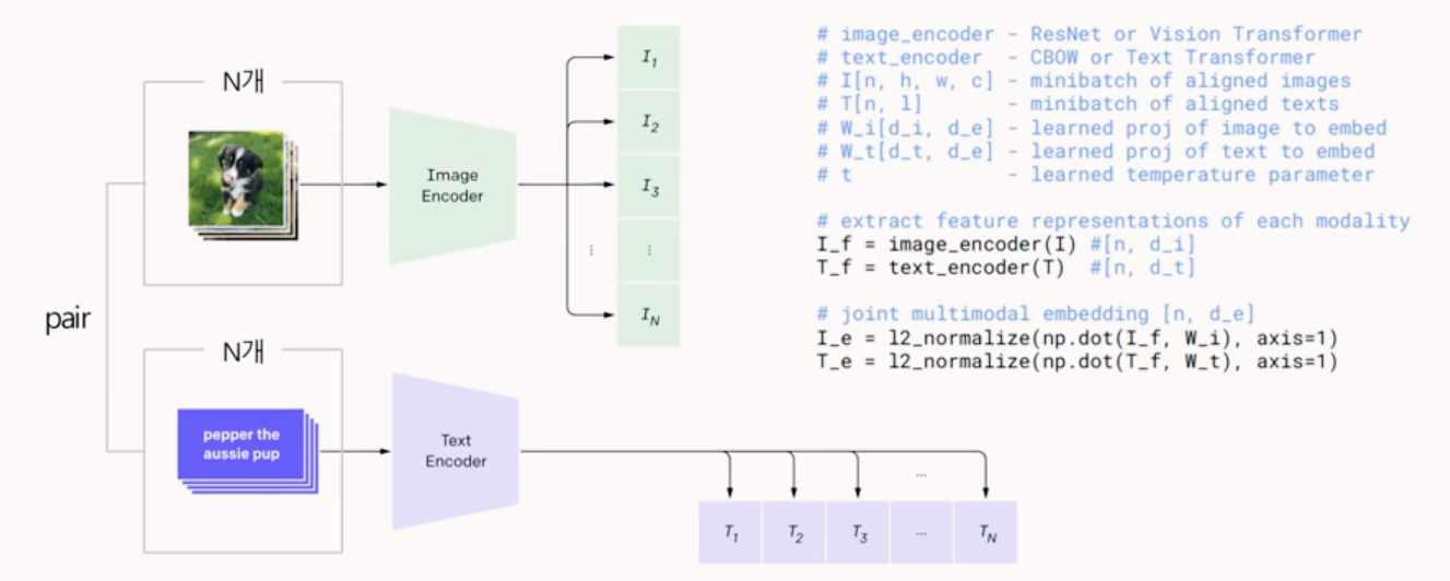 학습시키기 위해서는 정답이 필요합니다. 따라서 아래 이미지처럼 이미지와 텍스트 벡터간의 내적을 통해 코사인 유사도를 계산하고 Pair에 해당하지 않는 이미지 혹은 텍스트는 서로 다르다는 전제 하에 cross-entropy loss를 계산합니다. 총 N^2의 벡터 행렬이 생성될테고 N개는 positive pair, (N^2 - N)개는 negative pair이 될 것이며 이미지 기준으로 본다면 각 행에 대해서, 텍스트 기준으로 본다면 각 열에 대해서 loss를 계산합니다. 이러한 방식으로 각 이미지, 텍스트는 n개의 이미지, 텍스트의 loss 값을 알게 되고 이 두개의 loss를 평균내어 최종 loss를 계산하는 방식으로 유사도를 계산합니다.