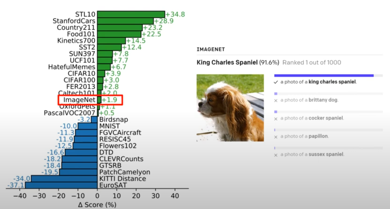아래 이미지는 CLIP의 강건함에 대한 자료입니다. ImageNet과 비교해서 왼쪽 그래프로 성능을 따져봐도 확실히 높은 정확도를 보이고 있습니다. 오른쪽 자료는 각각의 바나나 사진을 현실 이미지와 스케치 등 다양한 느낌의 이미지를 CLIP은 잘 인식하고 ImageNet은 잘 인식하지 못한다는 것을 알려주는 자료입니다. 이미지의 설명이 필요한 보통의 경우에는 ImageNet 데이터셋처럼 분명한 이미지만 있는 게 아니기 때문에 딥러닝 이미지 탐지 모델은 강건함을 필요로 합니다. 이러한 측면에서 CLIP은 아주 우수한 강건함을 가졌다고 할 수 있겠습니다.