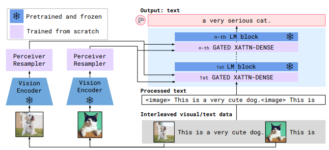 예를 들어, 사용자가 "매우 귀여운 강아지"라는 텍스트와 강아지 이미지를 입력으로 제공하면, Vision Encoder는 이미지를 특성 데이터로 변환하고, Perceiver Resampler는 이 데이터를 시각적 토큰으로 압축합니다. 이 시각적 토큰은 언어 모델에 입력되어, 모델이 이미지 내용을 이해하고 관련된 텍스트를 생성할 수 있도록 합니다. 결과적으로 모델은 " 매우 귀여운 강아지 "라는 문장을 자연스럽게 이어나갈 수 있습니다.
