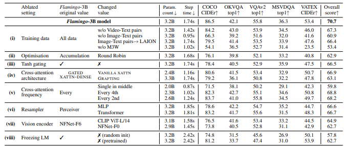 - 새로운 gated xattn-dense 블록을 모든 레이어에 추가하는 것이 성능에는 좋으나, 훈련 가능한 매개변수의 수와 모델의 시간 복잡성을 크게 증가시킵니다.