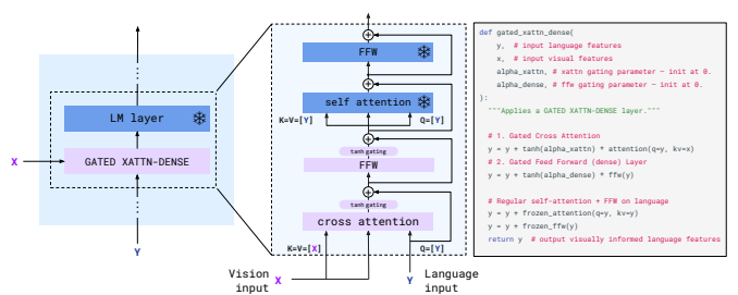 - Language Model (LM) Layers: 사전 훈련된 LM 레이어들은 텍스트 데이터의 처리를 담당하며, 이 레이어들 사이에 새로운 크로스 어텐션 레이어가 삽입됩니다.