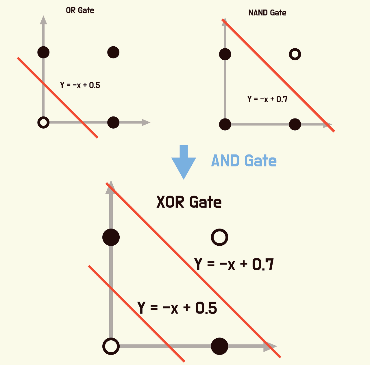 1. 이 3가지 논리 회로를 구현할 수 있었지만 배타적 논리합이라는 XOR 게이트를 만들 경우에는 한계가 발생한다.