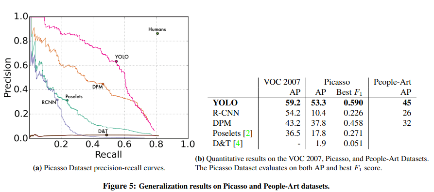 - YOLO는 VOC와 예술 작품 모두에서 높은 일반화 성능을 보여주며, 예술 작품에서도 타 모델에 비해 높은 성능을 유지함