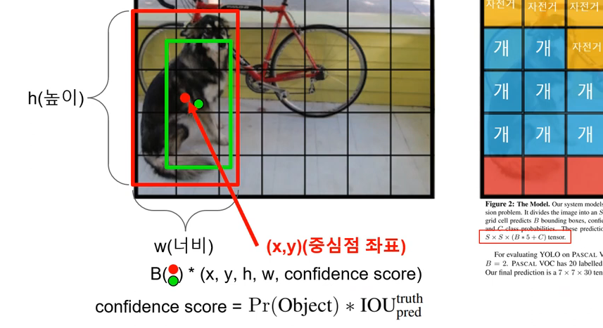 - 분할된 그리드 픽셀은 B개의 Bounding Box와 각 Box에 대한 Confidence Score를 예측합니다.