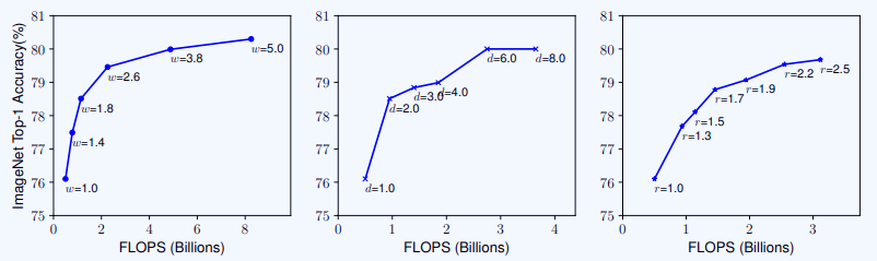 - 너비만 늘릴 경우(파란 선) : 깊이와 해상도를 1로 고정한 상태에서 너비만 늘리면 정확도 향상이 빠르게 한계에 도달함