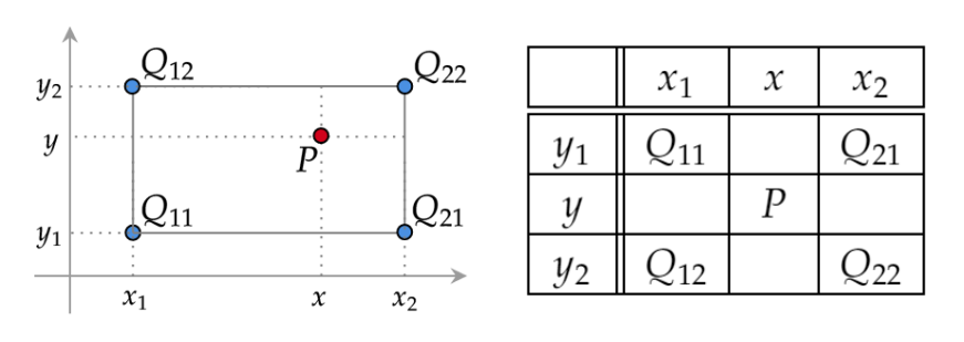 Bilinear interpolation은 2차원 좌표 상에서 두 좌표가 주어졌을 때 중간에 있는 값을 추정하는 방법이라고 합니다.