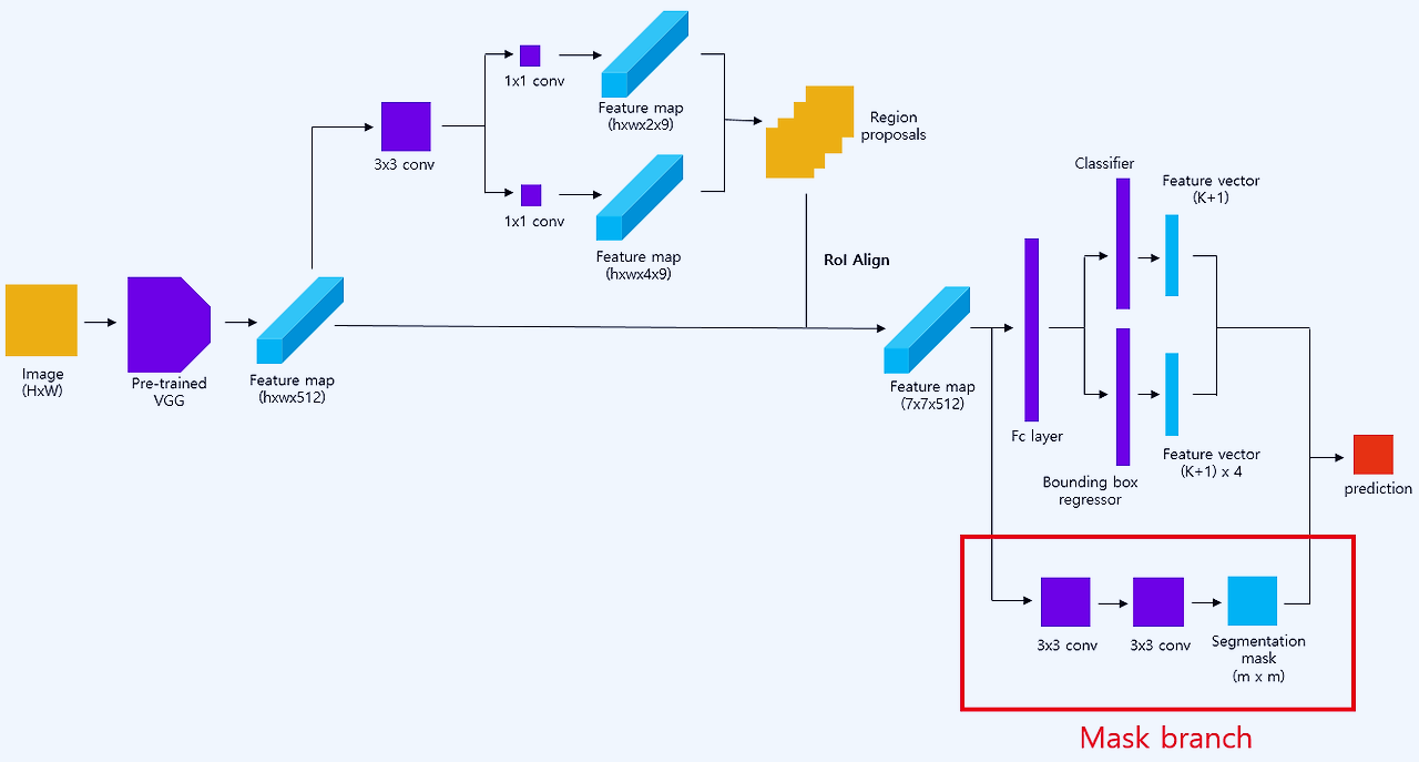 위에서 설명했다시피 Mask R-CNN은 Faster R-CNN 구조에 Mask Branch를 추가하였습니다.