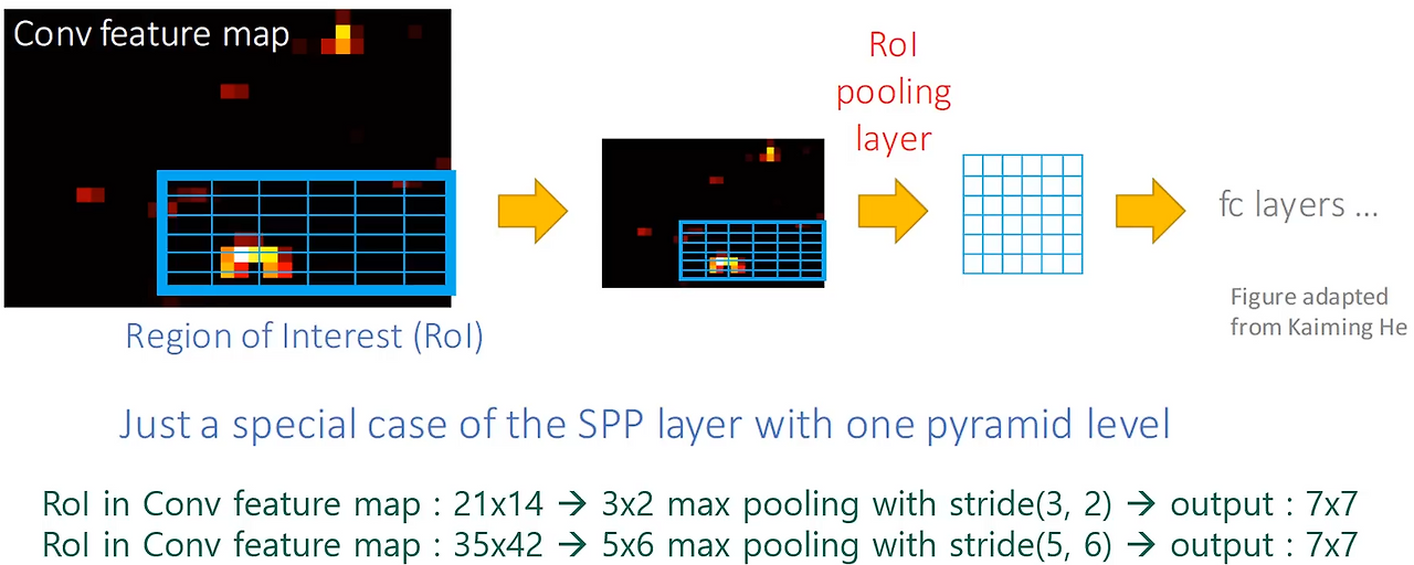 ROI Pooling Layer란, ConvNet를 지난 Feature Map에 사영된 ROI 영역에 대해 Pooling 작업을 거쳐서 FC Layer에 입력할 수 있도록 크기를 조정하는 역할을 하는 Layer입니다.