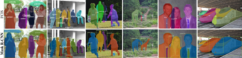 아래는 FCIS+++과 Mask R-CNN의 Instance Segmentation 결과를 비교하는 이미지입니다.