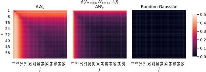 다음은 동일한 rank 설정에서 서로 다른 random seed로 학습한 $ΔW_q$와 $ΔW_v$의 하위공간 유사도를 측정한 실험입니다.