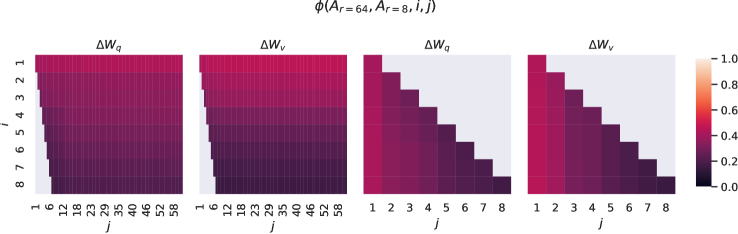 - $W_q$, $W_v$와 같은 self-attention weight를 저랭크로 조정하는 것이 성능 향상에 효과적