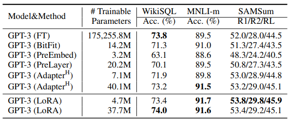 - LoRA는 GPT-3 실험에서도 Full fine-tuning 보다 적은 파라미터 수로 더 높은 성능을 기록