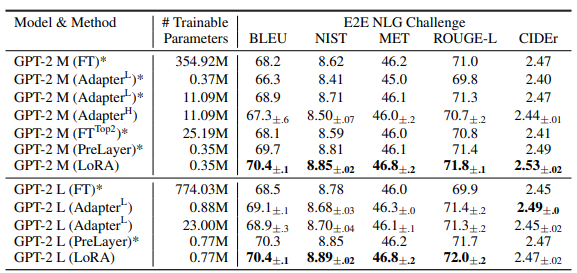 - 동일한 세팅 기준으로 Adapter와 동일한 성능을 보이나, LoRA는 더 단순한 구조