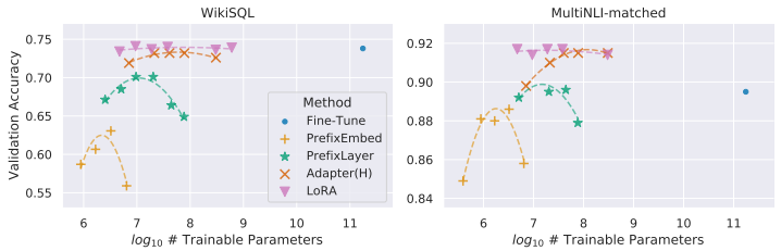 - 다른 방식(Prefix, Adapter 등)들은 일정 파라미터 이상이 되면 오히려 성능이 하락하는 문제를 보임