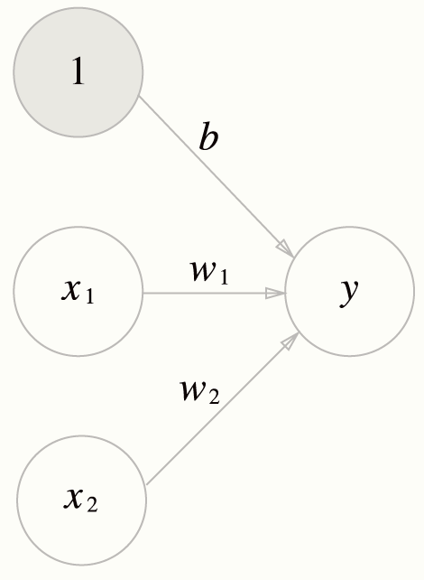 - h(x) = 0 (b + w1x1 + w2x2 <= 0) / 1 (b + w1x1 + w2x2 > 0)