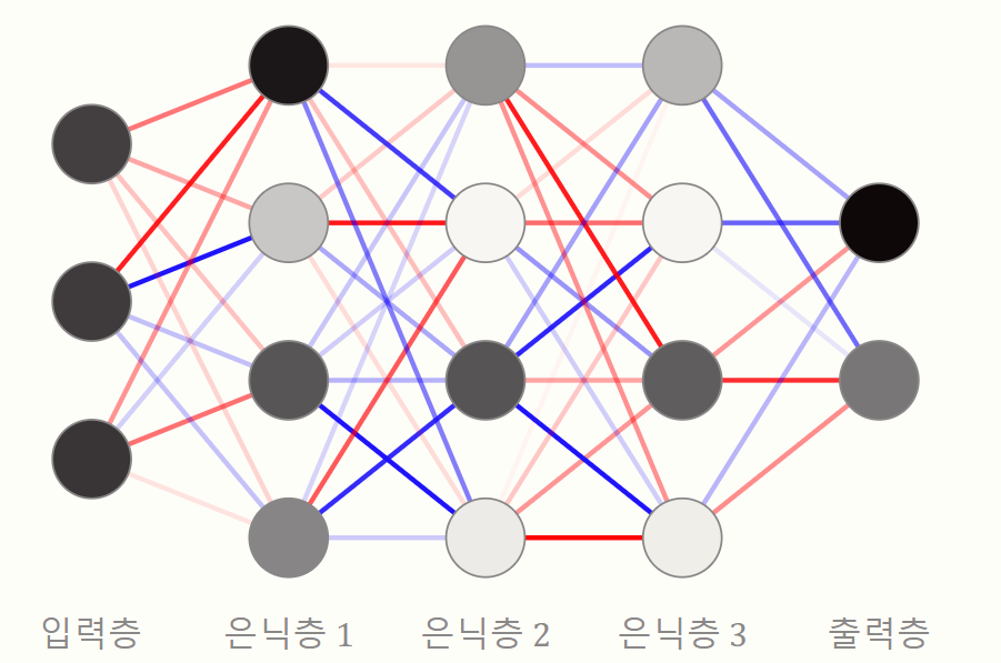 - 은닉층의 뉴런은 입력층, 출력층과 달리 사람 눈에는 직접적으로 보이지 않아 '은닉'층이라고 불리고 있습니다.